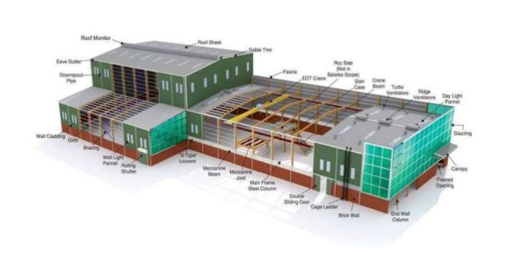 Pre-Engineered Buildings, well known as “PEB Buildings”, are Designed based on Customer requirements with geographical parameters and fabricate at certified codes and assembles at Job Site. PEB Buildings are consisting Column, Rafter, Beams, Bracings, Roof, wall cladding, Door Openings, Sky lights, Turbo Vents assembled with Nuts, Bolts and fasteners.
